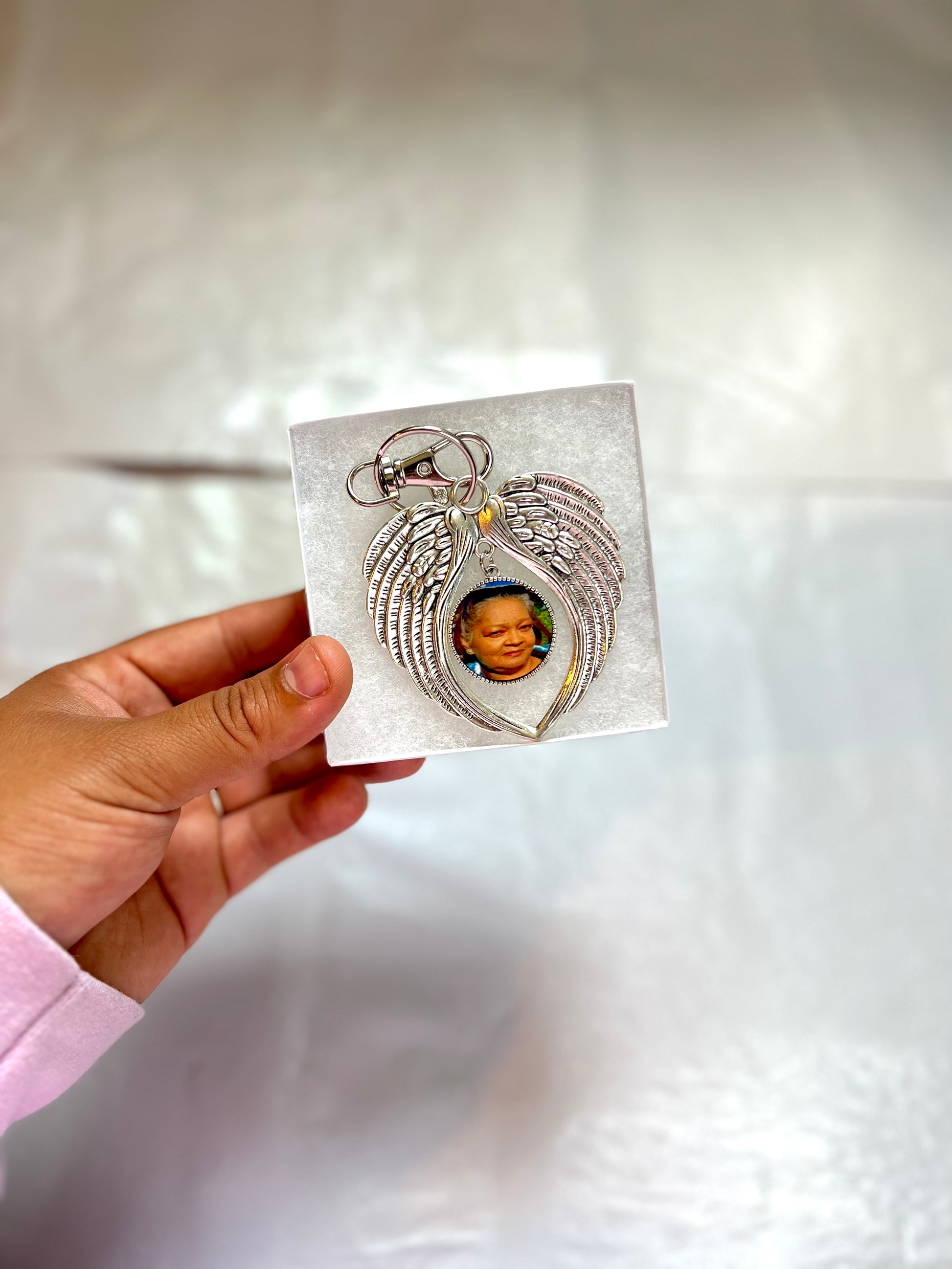 Personalized photo pendant shaped Keychain with angel wings in the back